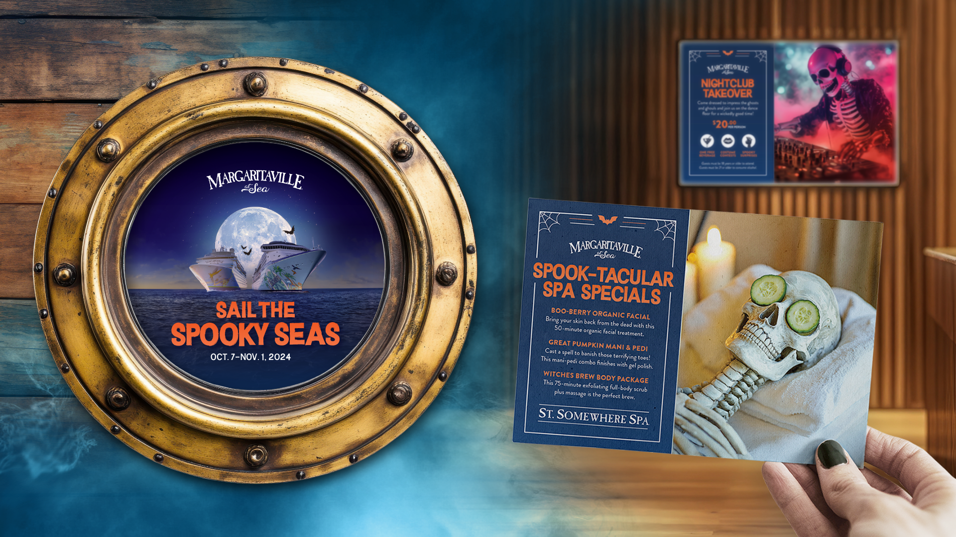 I designed the Sail the Spooky Seas campaign for Margaritaville at Sea Cruises, a Halloween-themed onboard experience running throughout October. The project included creating a full suite of branded assets — from logos, posters, menus, spa promotions, and bar crawl cards to digital signage and merchandise.